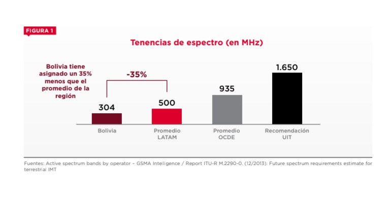 Bolivia cuenta con 304 MHz de espectro asignados a servicios móviles, un 35% por debajo del prome dio regional de 500 MHz. Esta cifra está lejos del promedio de los países de la Organización para la Cooperación y el Desarrollo Económicos (OCDE), que es de 935 MHz, y de la recomendación de 1.650 MHz de la Unión Internacional de Telecomunicaciones (UIT).