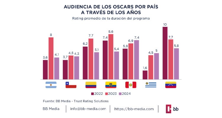 Con respecto a Latinoamérica, BB Media demuestra que en Argentina el rating promedio del año pasado, a lo largo de las tres horas de espectáculo, fue de 8.02, mientras que en 2024 fue de 4.13, lo que implica una caída del 51%. Esto puede deberse a que en 2023 estaba nominada la película “Argentina, 1985”, en tanto que en esta edición no contó con ninguna participación. Aunque Venezuela ha experimentado la pérdida más significativa de audiencia en las últimas ediciones, este año en particular, junto con Colombia y Ecuador, la disminución promedio fue similar. Por su parte, Chile se mantuvo estable. La excepción en Latinoamérica fue Uruguay, donde la audiencia aumentó, impulsada de manera verosímil por el interés del país en la nominación de “La Sociedad de la Nieve” como Mejor Película Extranjera, dado que contaba con actores uruguayos y el guion fue adaptado sobre una historia local.