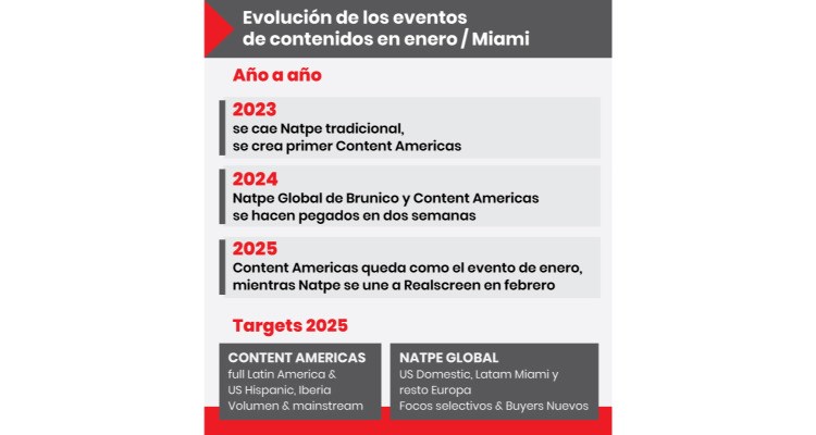En la industria americana de contenidos, el mes de enero en Miami se ha vuelto muy neurálgico en los últimos años, tras la pandemia. Primero en 2023 se cayó Natpe y lo reemplazó en tres meses Content Américas, luego en 2024 coexistieron la nueva Natpe Global de Brunico y CA que se hicieron pegadas en dos semanas, y ahora en 2025 se hace CA en la semana clásica (la tercera completa del mes) y Natpe pasó a febrero dos semanas más tarde, uniéndose a RealScreen. ¿Entonces? CA quedó acaparando el movimiento fuerte de Latam + Iberia, mientras Natpe se enfoca en el US domestic, el Latam de Miami y la conexión internacional con el resto de Europa. Kidscreen ya en 2024 dejó Miami para ir a San Diego, y este año sigue allí buscando más negocio fresco del Pacífico.