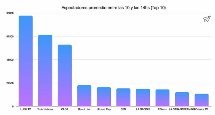 - Mediodía (10:00 am a 14:00 am): Este es el momento de mayor encendido general del día. LUZU TV lidera en audiencia, seguido por Todo Noticias y OLGA. Bondi Live y Urbana Play también se posicionan entre los más vistos, logrando combinar alcance e interacción a pesar de tener una base de suscriptores más pequeña.