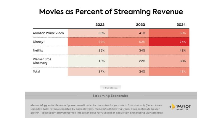 Un análisis de Parrot Analytics sobre los contenidos en Amazon Prime Video, Disney+, Netflix y HBO Max revela que las películas generan el 48% de su facturación, un porcentaje muy elevado en relación con el volumen de horas de contenido disponible que representan.La consultora señala que ‘durante años, se ha dicho que las películas, a diferencia de las series de televisión, estaban en declive, víctimas de una pandemia única en el siglo que cerró las salas de cine y un doble golpe por las prolongadas huelgas de la industria. Pero, hay nuevos datos que pintan un panorama diferente. De hecho, los servicios de streaming dependen más que nunca de las películas para mantener su crecimiento'.
