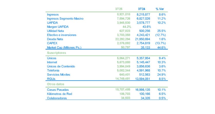 El Segmento Masivo registró ingresos por 7,595 millones de pesos, un incremento de 11.2%, con respecto al 3T24 Los ingresos totales tuvieron un crecimiento de 8.6% en el trimestre, con respecto al mismo periodo del año anterior, el más alto en los últimos 12 mesesMegacable Comunicaciones reportó resultados sólidos correspondientes al tercer trimestre de 2025 (3T25), con incrementos en ingresos, rentabilidad y suscriptores, reflejando la consolidación de su estrategia comercial y operativa.