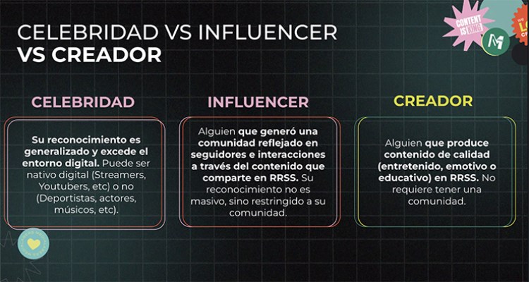 Señaló que la 'celebridad' puede acceder al 'nativo digital o no', el influencer genera una 'comunidad que no conocen¡ otros influencers, y el creador ¡genera contenido de calidad pero no necesita tener una comunidad' que lo siga expresamente. Para medir los resultados, se trabaja con los conceptos de awareness (percepción activa), consideration. conversion y loyalty (lealtad a la marca). Añadió que 'con las métricas hoy en día, los modelos tradicionales de conversión sobrevaloran la intención, en tanto las plataformas de Redes Sociales (RRSS) y entretenimiento son de discovery (descubrimiento).