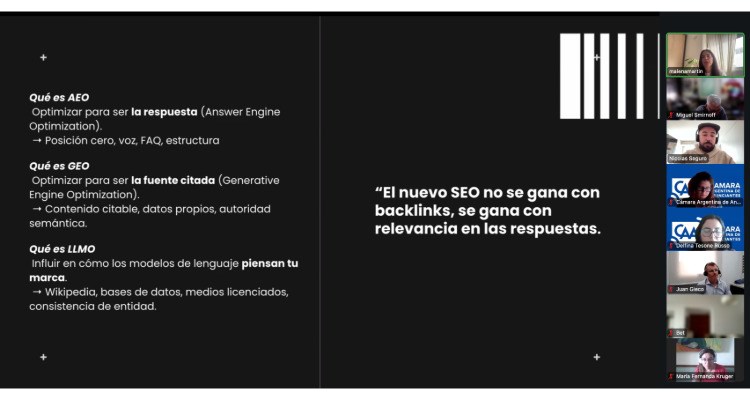 Mencionaron acrónimos como AEO (optimizar), GEO (optimizar para convertirse en la fuente de entrada, y LLMO (influir en cómo los modelos de lenguaje piensan sobre la marca), Señalaron que también conviene estar en Wikipedia y lo que definieron como 'medios licenciados': el nuevo SEO (Optimizador para buscadores) se gana con relevancia en las respuestas'.